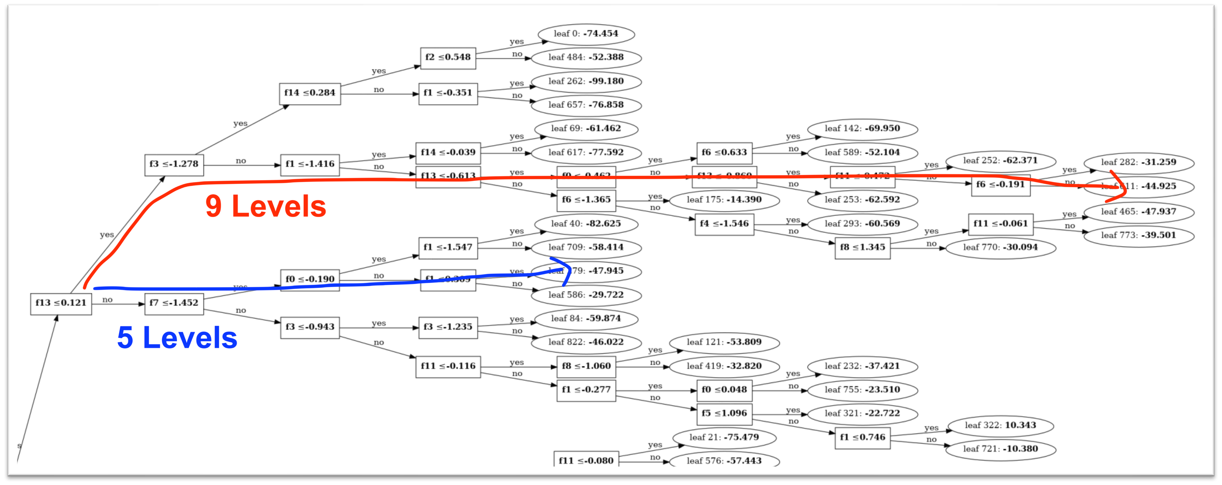 LightGBM grows trees leaf by leaf, always splitting the leaf with the highest loss reduction, regardless of depth. The result is asymmetric trees that often achieve better accuracy with fewer trees, but at the cost of highly variable path lengths. A single LightGBM tree can have leaves at depth 2 sitting next to leaves at depth 15.