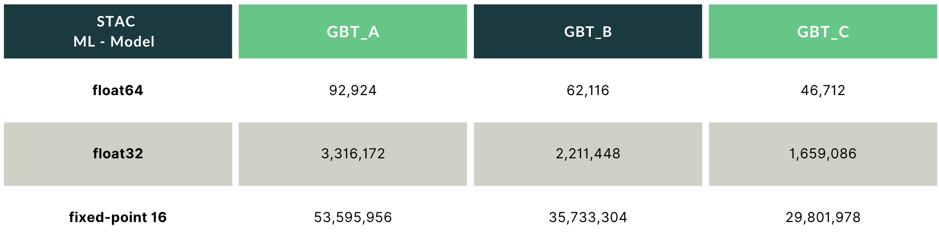 As Table 3 shows, GBT_A is comfortable at 32 bits. GBT_B needs 34, requiring a 64-bit accumulator with careful rounding. GBT_C needs 41 bits, again requiring a 64bit accumulator. The implication is that thresholds and leaf values must be handled at different precisions within the same implementation. The 32-bit figure for thresholds is achievable; for leaves, the required width is model-specific and must be computed, not assumed.